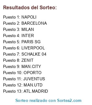 Lista de participantes: JUVENTUS, BARCELONA, NAPOLI, SCHALKE 04, MAN.UTD, MAN.CITY, INTER, ZENIT, LIVERPOOL, ATL.MADRID, OPORTO, MILAN, PARIS SG.
