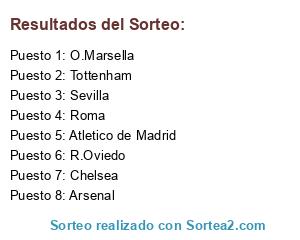 Lista de participantes: Atletico de Madrid, Tottenham, Chelsea, R.Oviedo, Arsenal, Sevilla, Roma, O.Marsella.