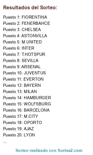 Lista de participantes: BARCELONA, MADRID, CHELSEA, LIVERPOOL, INTER, M.UNITED, VALENCIA, SEVILLA, ARSENAL, MILAN, ROMA, JUVENTUS, BAYERN, AT.MADRID, VILLARREAL, GIRONDINS, FIORENTINA, ASTONVILLA, WOLFSBURG, LYON, MARSEILLE, M.CITY, EVERTON, HAMBURGER, T.HOTSPUR, WERDER BREMEN, OPORTO, PANAHTINAIKOS, FENERBAHCE, AJAZ, GALATASARAY, SAO PAULO, .