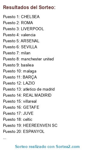 Lista de participantes: BARCELONA, AJAX, NAPOLES, ROMA, GETAFE, CHELSEA, REAL MADRID, LIVERPOOL, BETIS, ESPANYOL, JUVENTUS, MARESELLA, ATLETICO DE MADRID, RAYO, BASILEA, MILOAN, BAYER, SEVILLA, VILLAREAL, ARSENAL, BENFICA, VALENCIA, INTER.