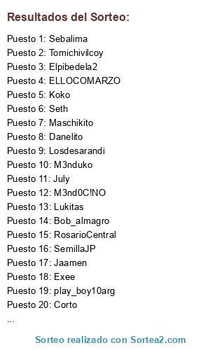 Lista de participantes: Sebalima, Seth, Losdesarandi, El_Gasolero, Tony_+10, Elpibedela2, RosarioCentral, Jaamen, Tomichivilcoy, Eliam, Danelito, Luciano, LioRC, Fede+10, Mellu, July, M3nd0C!NO, ELWILLYQUMBIA, Corto, SemillaJP, Alberto_A_T, Bob_almagro, Koko, Wolf, ELLOCOMARZO, play_boy10arg, Maschikito, Exee, Akerman, M3nduko, M@rchelle, Lukitas.
