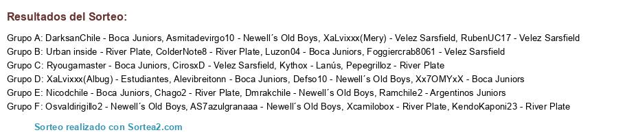Lista de participantes: KendoKaponi23 - River Plate, Xx7OMYxX - Boca Juniors, Asmitadevirgo10 - Newell´s Old Boys, Foggiercrab8061 - Velez Sarsfield, CirosxD - Velez Sarsfield, Osvaldirigillo2 - Newell´s Old Boys, Nicodchile - Boca Juniors, Ryougamaster - Boca Juniors, XaLvixxx(Mery) - Velez Sarsfield, XaLvixxx(Albug) - Estudiantes, Alevibreitonn - Boca Juniors, Kythox - Lanús, Xcamilobox - River Plate, Ramchile2 - Argentinos Juniors, Chago2 - River Plate, Pepegrilloz - River Plate, Luzon04 - Boca Juniors, Dmrakchile - Newell´s Old Boys, DarksanChile - Boca Juniors, ColderNote8 - River Plate, RubenUC17 - Velez Sarsfield, Urban inside - River Plate, Defso10 - Newell´s Old Boys, AS7azulgranaaa - Newell´s Old Boys.
