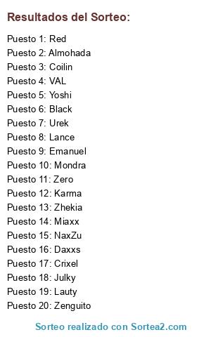 Lista de participantes: Urek, Coilin, Lauty, Almohada, Emanuel, Red, Yoshi, Miaxx, Karma, Mondra, Crixel, Daxxs, Zenguito, Black, Lance, NaxZu, Julky, Zhekia, VAL, Zero.