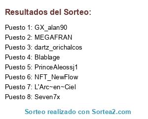 Lista de participantes: MEGAFRAN, PrinceAleossj1, L'Arc~en~Ciel, dartz_orichalcos, GX_alan90, NFT_NewFlow, Blablage, Seven7x.