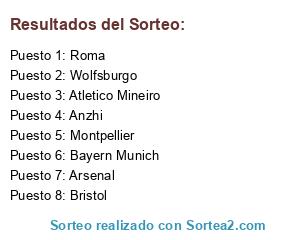 Lista de participantes: Bayern Munich, Montpellier, Wolfsburgo, Arsenal, Anzhi, Roma, Atletico Mineiro, Bristol.