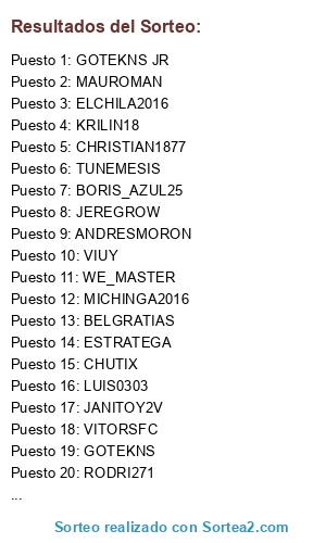 Lista de participantes: ELCHILA2016, JANITOY2V, VITORSFC, WE_MASTER, RUSSITO, CHUTIX, CHRISTIAN1877, OGT, TUNEMESIS, FITOFARAIS, RODRI271, JEREGROW, MAUROMAN, JORGE-RIVER, SEBAMAX1918, KURILIN, ESTRATEGA, BRANDONSILVEIRA, LUIS0303, ANDRESMORON, GOTEKNS, GOTEKNS JR, BORIS_AZUL25, VIUY, MICHINGA2016, KRILIN18, BELGRATIAS.