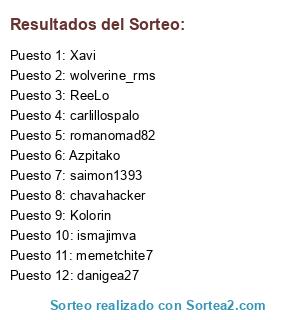 Lista de participantes: romanomad82, Kolorin, saimon1393, ismajimva, memetchite7, wolverine_rms, chavahacker, danigea27, Xavi, ReeLo, carlillospalo, Azpitako.