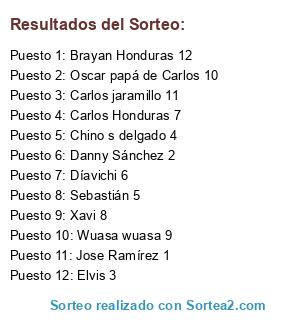 Lista de participantes: Jose Ramírez 1, Danny Sánchez 2, Elvis 3, Chino s delgado 4, Sebastián 5, Díavichi 6, Carlos Honduras 7, Xavi 8, Wuasa wuasa 9, Oscar papá de Carlos 10, Carlos jaramillo 11, Brayan Honduras 12.