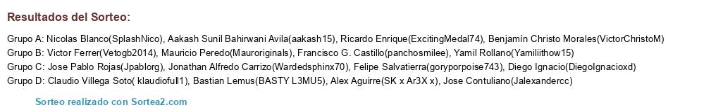 Lista de participantes: Aakash Sunil Bahirwani Avila(aakash15), Alex Aguirre(SK x Ar3X x), Bastian Lemus(BASTY L3MU5), Benjamín Christo Morales(VictorChristoM), Claudio Villega Soto( klaudiofull1), Diego Ignacio(DiegoIgnacioxd), Felipe Salvatierra(goryporpoise743), Francisco G. Castillo(panchosmilee), Jonathan Alfredo Carrizo(Wardedsphinx70), Jose Contuliano(Jalexandercc), Jose Pablo Rojas(Jpablorg), Mauricio Peredo(Mauroriginals), Nicolas Blanco(SplashNico), Ricardo Enrique(ExcitingMedal74), Victor Ferrer(Vetogb2014), Yamil Rollano(Yamiliithow15).
