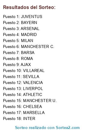 Lista de participantes: ROMA, ATHLETIC, INTER, MILAN, MADRID, BARSA, ARSENAL, BAYERN, MANCHESTER U., MANCHESTER C., CHELSEA, SEVILLA, JUVENTUS, LIVERPOL, VALENCIA, AJAX, VILLAREAL, MARSELLA.