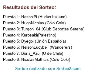 Lista de participantes: HugoNicolas (Colo Colo), Nashoif9 (Audax Italiano), NelsonLucybell (Wanderers), Dyegol (Unión Española), NicolasMathias (Colo Colo), Turgon_04 (Club Deportes Serena), Boris_Azul (U de Chile), Kurosaki(Palestino).