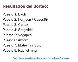 Lista de participantes: Rachet-king, Abforz, Sergividal, Cortex, Ekoh, Mateyita / Soto, Fer_don / Cases89, Vegapes.