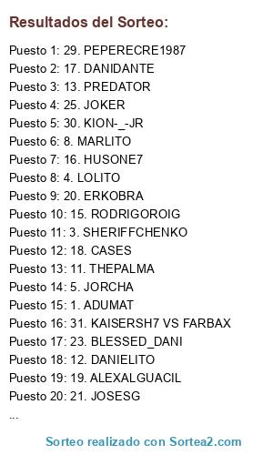 Lista de participantes: 1. ADUMAT, 2. ISRA_MUEKA, 3. SHERIFFCHENKO, 4. LOLITO, 5. JORCHA, 6. BAENA_BETIS, 7. MESTRE, 8. MARLITO, 9. VALLE, 10. JOANFCB, 11. THEPALMA, 12. DANIELITO, 13. PREDATOR, 14. DIEGORDZ, 15. RODRIGOROIG, 16. HUSONE7, 17. DANIDANTE, 18. CASES, 19. ALEXALGUACIL, 20. ERKOBRA, 21. JOSESG, 22. PEPTEAM, 23. BLESSED_DANI, 24. FER_DON3P, 25. JOKER, 26. EKOH, 27. FRAN1985561, 28. DBANDE, 29. PEPERECRE1987, 30. KION-_-JR, 31. KAISERSH7 VS FARBAX, 32. ALE_ITA87 vs FISTA.