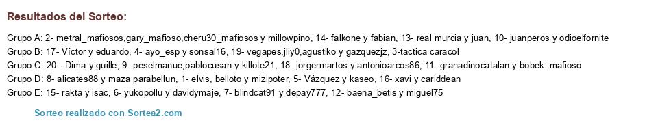 Lista de participantes: 1- elvis, belloto y mizipoter, 2- metral_mafiosos,gary_mafioso,cheru30_mafiosos y millowpino, 3-tactica caracol, 4- ayo_esp y sonsal16, 5- Vázquez y kaseo, 6- yukopollu y davidymaje, 7- blindcat91 y depay777, 8- alicates88 y maza parabellun, 9- peselmanue,pablocusan y killote21, 10- juanperos y odioelfornite, 11- granadinocatalan y bobek_mafioso, 12- baena_betis y miguel75, 13- real murcia y juan, 14- falkone y fabian, 15- rakta y isac, 16- xavi y cariddean, 17- Víctor y eduardo, 18- jorgermartos y antonioarcos86, 19- vegapes,jliy0,agustiko y gazquezjz, 20 - Dima y guille.
