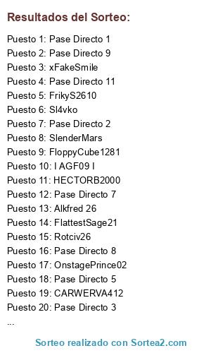 Lista de participantes: I AGF09 I, FlattestSage21, JFMADRID7, Rotciv26, SlenderMars, CARWERVA412, OnstagePrince02, MATIAS 1909876, ErBetiicoJose, Matias192, FloppyCube1281, HECTORB2000, Zz iReViiVal zZ, Alkfred 26, Sl4vko, betogaso, xigor87x, Shiryu94, Erbaastian, Martinqro, FrikyS2610, xFakeSmile, Pase Directo 1, Pase Directo 2, Pase Directo 3, Pase Directo 4, Pase Directo 5, Pase Directo 6, Pase Directo 7, Pase Directo 8, Pase Directo 9, Pase Directo 10.