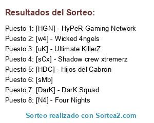 Lista de participantes: [DarK] - DarK Squad, [N4] - Four Nights, [HGN] - HyPeR Gaming Network, [sMb], [sCx] - Shadow crew xtremerz, [HDC] - Hijos del Cabron, [w4] - Wicked 4ngels, [uK] - Ultimate KillerZ.