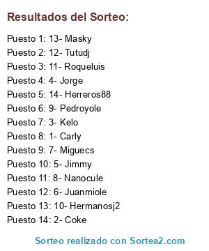 Lista de participantes: 1- Carly, 2- Coke, 3- Kelo, 4- Jorge, 5- Jimmy, 6- Juanmiole, 7- Miguecs, 8- Nanocule, 9- Pedroyole, 10- Hermanosj2, 11- Roqueluis, 12- Tutudj, 13- Masky, 14- Herreros88.