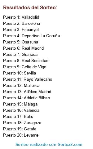 Lista de participantes: Athletic Bilbao, Atlético Madrid, Barcelona, Betis, Celta de Vigo, Deportivo La Coruña, Espanyol, Getafe, Granada, Levante, Málaga, Mallorca, Osasuna, Rayo Vallecano, Real Madrid, Real Sociedad, Sevilla, Valencia, Valladolid, Zaragoza.
