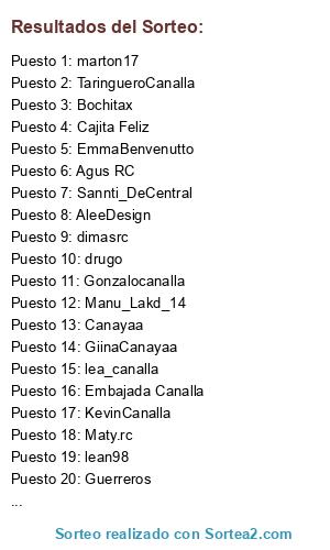 Lista de participantes: lean98, Maty.rc, lea_canalla, Gonzalocanalla, MaTuT3, KevinCanalla, lukasss, TaringueroCanalla, Bochitax, Canayaa, marton17, Embajada Canalla, EmmaBenvenutto, Cajita Feliz, Sannti_DeCentral, Manu_Lakd_14, dimasrc, BestGoalEverHD720p, AleeDesign, drugo, GiinaCanayaa, Agus RC, Guerreros.