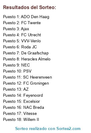 Lista de participantes: ADO Den Haag, Ajax, AZ, De Graafschap, Excelsior, FC Groningen, FC Twente, FC Utrecht, Feyenoord, Heracles Almelo, NAC Breda, NEC, PSV, Roda JC, SC Heerenveen, Vitesse, VVV-Venlo, Willem II.