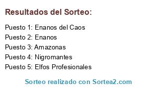 Lista de participantes: Altos Elfos, Amazonas, Caos, Elfos Profesionales, Elfos Oscuros, Elfos Silvanos, Enanos, Enanos del Caos, Goblins, Halfings, Hombres Lagarto, Humanos, Khemri, Nigromantes, No Muertos, Nórdicos, Nurgle, Ogros, Orcos, Skaven, Vampiros.