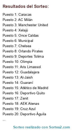 Lista de participantes: Borussia Dortmund, Bayern Munich, Boca Juniors, River Plate, Salzburgo, Brujas, Bolívar, Oriente Petrolero, Santos, Atlético Mineiro, Millonarios, Once Caldas, Barcelona SC, Emelec, Celtic, Rangers, Barcelona, Real Madrid, Lyon, Marsella, AEK Atenas, Panathinaikos, Xelajú, Comunicaciones, Ajax, PSV Eidhoven, Real España, Marathon, Manchester United, Manchester City, AC Milán, Juventus, Lions XII, Sarawak, América, Guadalajara, Molde, Rosenborg, Lech Poznan, Wisla de Cracovia, Porto, Benfica, Al-Jaish, Al-Sadd, Shanghai Shenhua, Dalian Aerbin, Alajuelense, Caledonia AIA, Cerro Porteño, Chorrillo, Deportivo Águila, FAS, Guaraní, Herediano, Isidro Metapán, Libertad, Olimpia, Puerto Rico Islanders, Tauro, Unión Española, Universidad Católica, Universidad de Chile, W Connection, Real Estelí, Daegu, Daejon Citizen, Kaizer Chiefs, Orlando Pirates, CFR Cluj, Otetul Galati, Anzhi, Zenit, Helsingborgs, AIK Solna, Basel, Zürich, Fenerbahçe, Galatasaray, Dynamo Kyiv, Shakhtar Donetsk, Peñarol, Club Nacional de F., Houston Dynamo, Los Angeles, Táchira, Caracas, Schalke 04, Bayer Leverkusen, Argentinos Juniors, Independiente, Rapid Wien, Anderlecht, San José, The Strongest, Corinthians, São Paolo, Deportes Tolima, Júnior, APOEL, Aris Limassol, Køvenhavn, Nordsjælland, LDU Quito, Deportivo Quito, Atlético de Madrid, Valencia, PSG, Montpellier, Olympiakos, Aris Salonic, Municipal, Heredia, Twente, AZ Alkmaar, CD Olympia, Motagua, Arsenal, Chelsea, Ínter de Milán, Napoli, Cruz Azul, UNAM, Sporting Braga, Sporting Lisboa, Metallist Kharkiv, Rubin Kasan, Young Boys, Liverpool.