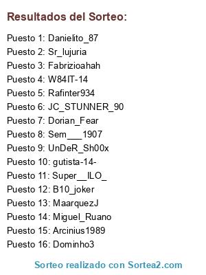 Lista de participantes: Miguel_Ruano, Arcinius1989, JC_STUNNER_90, Sr_Lujuria.