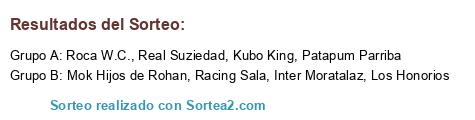 Lista de participantes: Mok Hijos de Rohan, Inter Moratalaz, Racing Sala, Real Suziedad, Los Honorios, Patapum Parriba, Kubo King, Roca W.C..