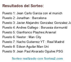 Lista de participantes: Jean Carlo Garcia con el munich, Jonathan : Barcelona, Nacho Gutierrez YT : Real Madrid, Nestor : Man City, Gianfranco Playtres:Arsenal, Edson Aguilar:Man Uni, Javier Alejandro Gonzalez Gonzalez:Juventus, Jean Paul Alvarado Oguilve:PSG, Andres Gallego : Borussia dormuntd.