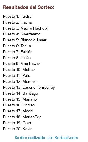 Lista de participantes: Hacha, Julián, Endien, Mariano, MarianZep, Palu, Mochi, Santiago, Max Power, Morens, Gian, Kevin, Riverteamo, Teeka, Fabián, Matrez, Facha, Laser o Temperley, Maxi o Nacho xfl, Blanco o Laser.