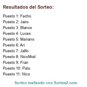 Lista de participantes: Nico, NicoMod, Blanco, Mariano, Facho, Fran, Jairo, Lucas, Palu, Jalfo, Ari.