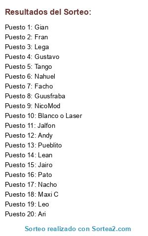 Lista de participantes: Jalfon, Nacho, Jairo, NicoMod, Facho, Lean, Ari, Tango, Pueblito, Pato, Fran, Gian, Gustavo, Andy, Lega, Guusfraba, Leo, Maxi C, Nahuel, Blanco o Laser.