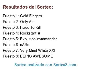 Lista de participantes: BEING AWESOME, Evolution commander, Rockstart' #, Fixed To Kill, cARc, Only Aim, Very Mind White XXI, Gold Fingers.