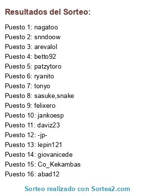 Lista de participantes: snndoow, felixero, betto92, lepin121, tonyo, ryanito, -jp-, giovanicede, daviz23, abad12, jankoesp, patzytoro, arevalol, nagatoo, sasuke,snake, Co_Kekambas.