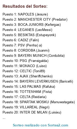 Lista de participantes: CADIZ (Falin), VILLAREAL (Negri), EVERTON (Alenzema), AJAX (Sheriffchenko), SAINT- ETTIENE (Wakandu), VALENCIA (AlePGL), TOTTENHAM (Fista), ATHLETIC DE BILBAO (Fuenyool), LEGANES (LeoMessi), JUVENTUS (Soto), CELTA (Reidaria), PSV (Penha) a), MILAN (Lincedeo), CELTIC (Toni89), LIVERPOOL (Wan), NAPOLES (Jesure), RACING CLUB (AdriOrtiz), LAS PALMAS (Rafuka), ATALANTA(Peperecre), BESIKTAS (Estupeyonk), GALATASARAY (paco), MANCHESTER CITY (Predator), BAYERN MUNICH (Cordubita), SPARTAK MOSKU (Manuwatagata), BOCA JUNIORS (Kefergas), INTER DE MILAN (Luisixu), SAMPDORIA (Ramonelectrico), WEST HAM (Kamikaze), CORDOBA (Juanmi), PSG (Fransigalda), MONACO (Luiso), BAYERN LEVERKUSEN (Baricelli).