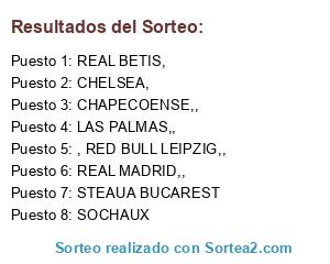 Lista de participantes: JUVENTUS,, SOCHAUX, BARCELONA,,, VILLARREAL,,, CHELSEA,, ARSENAL, , PSG, SEVILLA, LEGANES, ,, AJAX, ,, GRANADA,,, NAPOLES,,, BORUSSIA DORTMUND,,, LAS PALMAS,,, REAL MADRID,,, LUGO,,, ROMA, ,, ALBACETE,, , MONACO,,, MANCHESTER UNITED,,, STEAUA BUCAREST, , DEPORTIVO,, ATHLETIC BILBAO,,, LENS,,, ATLETICO MADRID,,, CHAPECOENSE,,, LEICESTER CITY,,, REAL BETIS,, , RED BULL LEIPZIG,,, CELTA VIGO,,, MILAN,,, BESIKTAS,,, SHAKHTAR DONESTK, , , LIVERPOOL,, , FENERBAHCE,,, VALENCIA...