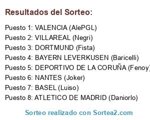 Lista de participantes: DEPORTIVO DE LA CORUÑA (Fenoy), BAYERN LEVERKUSEN (Baricelli), VALENCIA (AlePGL), VILLAREAL (Negri), NANTES (Joker), DORTMUND (Fista), ATLETICO DE MADRID (Daniorlo), BASEL (Luiso).