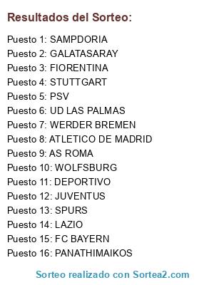 Lista de participantes: LAZIO, JUVENTUS, UD LAS PALMAS, DEPORTIVO, PSV, WERDER BREMEN, FC BAYERN, ATLETICO DE MADRID, SPURS, AS ROMA, FIORENTINA, WOLFSBURG, STUTTGART, GALATASARAY, PANATHIMAIKOS, SAMPDORIA.