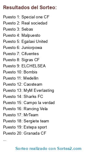 Lista de participantes: FC Cartagena, Malpuesto, Colts Patriots, MyM Everlasting, Bombis, Del Piero FC, Egalaxi United, Montefrio F.C, Cifuentes, Sigras CF, Sharks FC, Sporting de limon, Campo la verdad, Real sociedad, MrTeam, FC Huracan, Estepa sport, Sergiete team, Juniorpowa, Special one CF, Medellin, Sebas, Caosteam, Rancing Vela, ELCHELSEA, Granada CF.