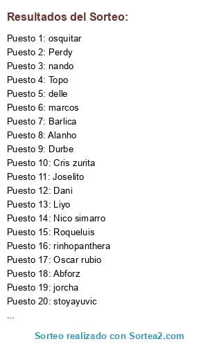 Lista de participantes: Marlito, Caubo, Cheche, Claped, Cris zurita, Durbe, Florenkiko, Good, Joselito, Liyo, Luismi, rinhopanthera, Roqueluis, Topo, Pau, Barlica, Dementor, Alanho, Nico simarro, Abforz, Corleone, Oscar rubio, luccas, Perdy, cases, nando, jorcha, stoyayuvic, marcos, osquitar, Dani, delle.