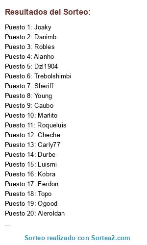 Lista de participantes: Marlito, Abforz, Caubo, Cheche, Claped, Danimb, Durbe, Ekoh, Florenkiko, Ogood, Jorcha, Liyo, Luismi, Marcoslg, Ferdon, Rinhopantera, Robles, Roqueluis, Sheriff, Topo, Dzl1904, Dementor, Young, Kobra, Alanho, Lucas, Trebolshimbi, Aleroldan, Joaky, Carly77, Jhoeel, Pau24.