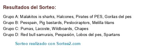 Lista de participantes: Halcones, Lacoste, Lobos del pes, Melilla titans, Wildboards, Pig bastards, Pesspain, Red bull samurais, Pespasión, Peslociraptors, Malakitos is sharks, Spartans, Pirates of PES, Chapes, Pumas, Gorilas del pes.