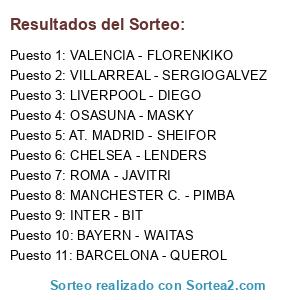 Lista de participantes: LIVERPOOL - DIEGO, INTER - BIT, VALENCIA - FLORENKIKO, ROMA - JAVITRI, CHELSEA - LENDERS, OSASUNA - MASKY, MANCHESTER C. - PIMBA, BARCELONA - QUEROL, VILLARREAL - SERGIOGALVEZ, AT. MADRID - SHEIFOR, BAYERN - WAITAS.