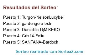 Lista de participantes: Danielillo-DjMiKEKO, SANTANA-Bardock, Cris14-Feliu, Turgon-NelsonLucybell, gardengore-bstn.