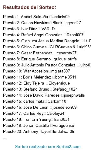 Lista de participantes: Federico Reus Scailarg Scailarg, Carlos Sánchez karl_Sanz04, Anibal Arauz Anibalin, David Wong gabifabi, Reinaldo Pineda reinaldo1017, Boris Melendez bormel0511, Orlando L Hamilton olh2k10, Jose De Leon josedeleon09, Abdiel Saldaña abdiels09, Omi Boystar Small omi_rmd, Rafael Angel Gonzalez Rkool007, Christian Felipe x__Akuma__X, Jonathan Omar Gonzalez Franco jona-elgalactico, Cesar Fernandez cesarpty27, Julio Antonio Pastor Gonzalez julito03007, Raul Ernesto Forde Herrera Raul13forde, Johan Castillo veraguense, Jose David Paredes josephwalls, Hansel Hans Hawkins hanselhans, Peter De Nicolo terpi10, Gianluca Jesus Medina Dangelo Lt_D4ngelo15, Gustavo Herrera X_KaiT3n09_X, Jose Alberto joalchu, Danielle Brnl Unleashes_hell, Blas Ruiz droopy_507, JereMy Rivas ZombieHunter224_, Jorge Icaza Urre12, Juan Antonio Mamani Juanbells23, Yitzuli Morales aztutoup, War Accesion mglata507, Anthony Hayer lordofwar05, Chino Cuevas GLRCuevas & Luigi939, Edwin Espinoza Emes91, Iron Lim Yueng Iran3031, Jesusito Chock NARUTO-50-, Nestor Moran nestorbarria98, Christopher Carson Chorchpana, Javier Hernandez awakensilence507, Stefano Bruno Stefano_1024, Eloy Tejeira Eloyenrique, Amilkar Moreno Rios morenosworld10, Guiovanni Salmeron Valle-siu, Nevil Guzman Nevguz, Ricardo Del Cid rikylokon, Kenmuel King muel507, Carlos Hawkins Black_legend27, Edú Martinez Cubías eduardo_1326, Roy Cárdenas RKPOR149PTY, carlos mata Carkam10, Ivar Diaz IVAR_D, Enrique Serrano quique_strife, Rod Herrera FISTO06, Cristhian Lindo Calch28, Carlos Rey Caloley24.