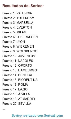 Lista de participantes: LAZIO, VILLAREAL, MARSELLA, JUVENTUS, LEBERKUSEN, AT.MADRID, SEVILLA, W.BREMEN, EVERTON, G.BURDEOS, B.MUNICH, BENFICA, A.VILLA, WOLSBURGO, ROMA, OPORTO, MILAN, LYON, FIORENTINA, TOTENHAM, HAMBURGO, VALENCIA, NAPOLES, M.CITY.
