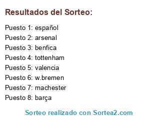 Lista de participantes: arsenal, benfica, w.bremen, valencia, machester, español, tottenham, barça.