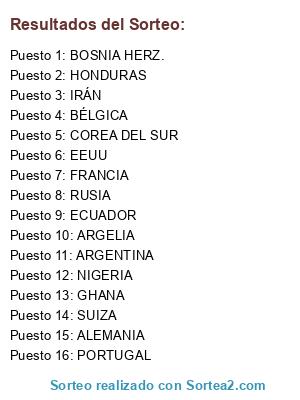 Lista de participantes: SUIZA, ECUADOR, FRANCIA, HONDURAS, ARGENTINA, BOSNIA HERZ., NIGERIA, IRÁN, ALEMANIA, PORTUGAL, GHANA, EEUU, BÉLGICA, ARGELIA, RUSIA, COREA DEL SUR.