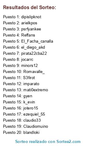 Lista de participantes: jotero15, arielkpos, k_evin, pirata22cba22, psrfyankee, dipislipknot, imparato, Romavalle_, blandloki, el_diego_akd, minors12, jocarrc, gyen, El_Facha_canalla, ezequiel_55, claudio33, Reffans, Claudiomuino, S3firot, mati0extremo.