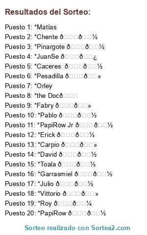 Lista de participantes: *PapiRow 👍🏽, *Caceres 👍🏽, *Chente 👍🏽, *Pablo 👍🏽, *Julio 👍🏽, *PapiRow Jr 👍🏽, *Toala 👍🏽, *Erick 👍🏽, *David 👍🏽, *Garrasmiel 👍🏽, *JuanSe 👍🏿, *the Doc😈, *Pinargote 👍🏽, *Matías, *Vittorio 👍🏻, *Orley, *Roy 👍🏼, *Carpio 👍🏻, *Pesadilla 👍🏻, *Fabry 👍🏻.
